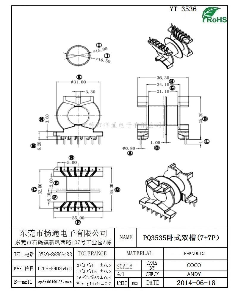 PQ35电木骨架PQ3535双槽骨架PQ3535变压器骨架 YT-3536