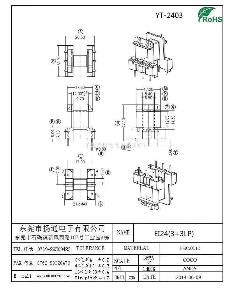 EI24电木骨架EI24变压器骨架 EI24高频骨架EI24单槽骨架卧式3+3L YT-2403