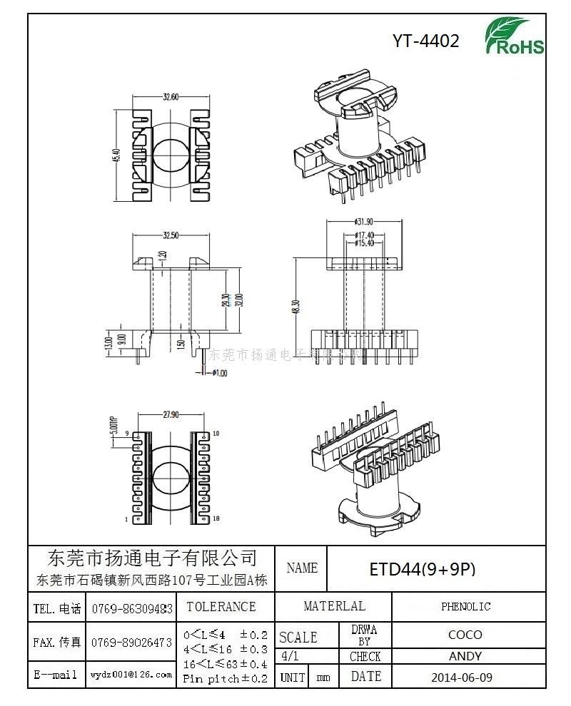 ETD44电木骨架ETD44变压器骨架 ETD44高频骨架ETD44单槽骨架立式9+9 YT-4402
