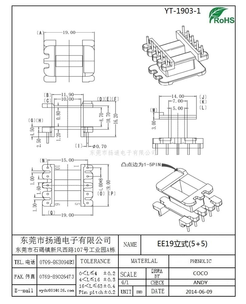 EE19变压器骨架EE19电木骨架EE19高频骨架 立式5+5P YT-1903-1