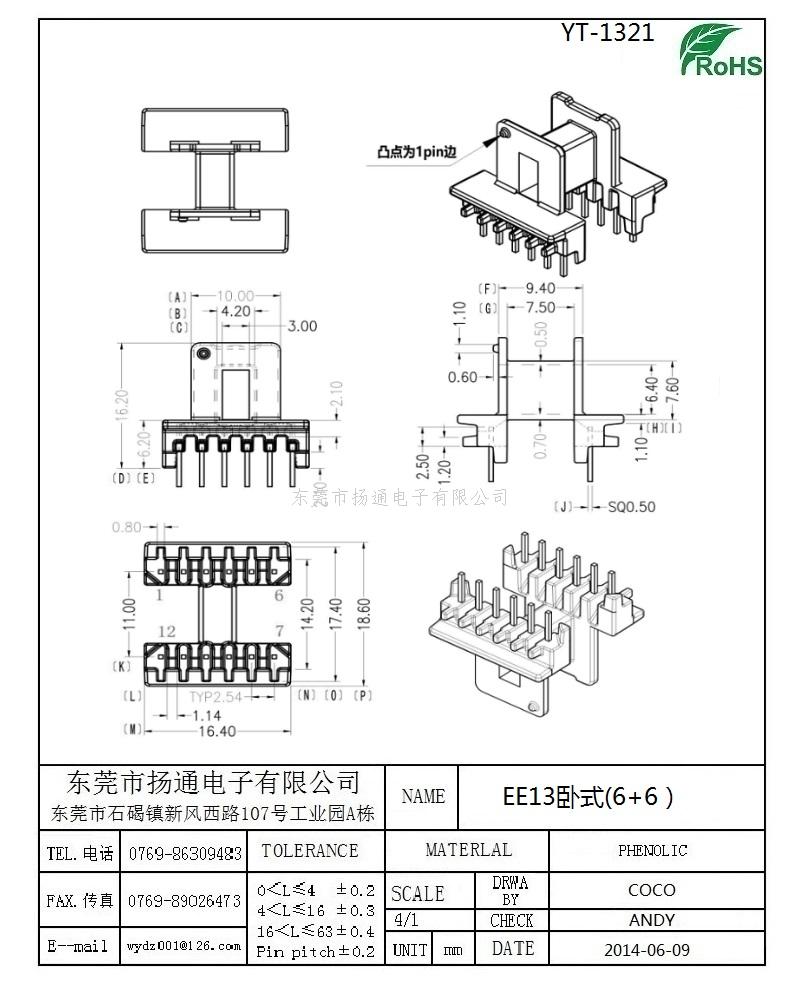 EE13变压器骨架EE13电木骨架EE13高频骨架 卧式6+6P YT-1321