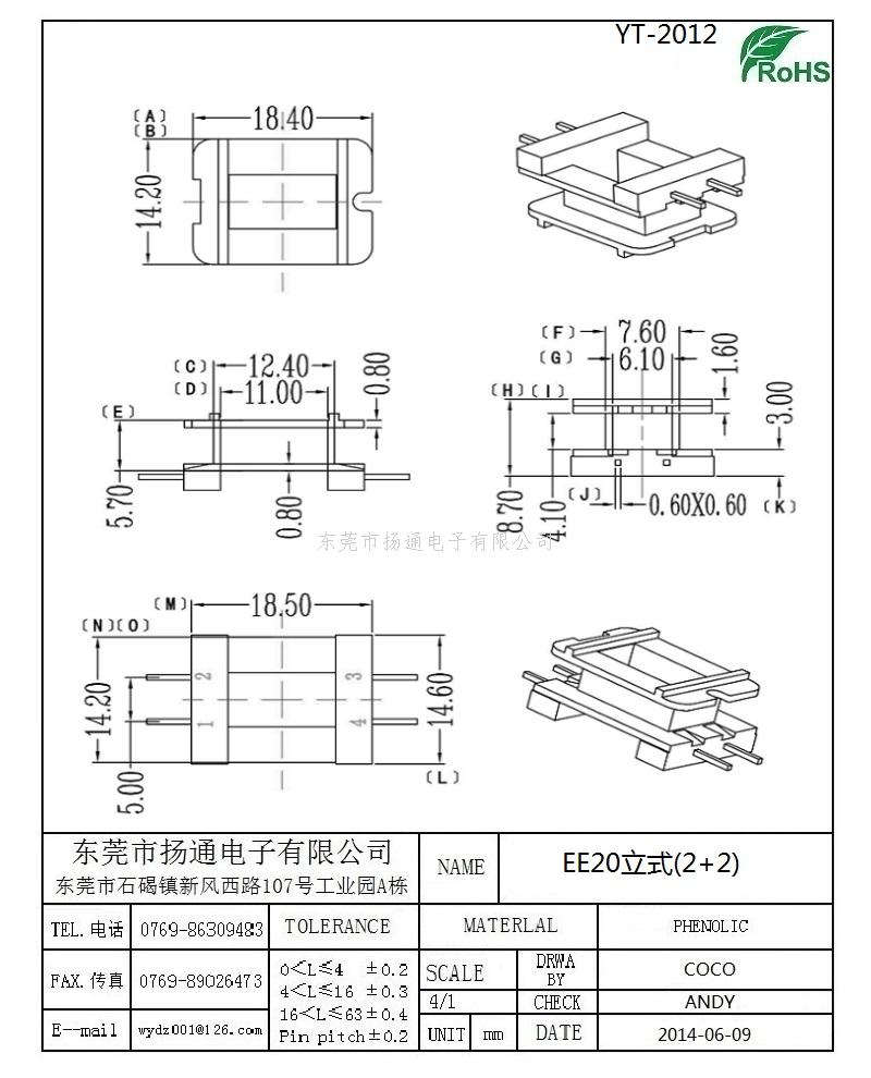 EE20变压器骨架EE20电木骨架EE20高频骨架 立式2+2P YT-2012