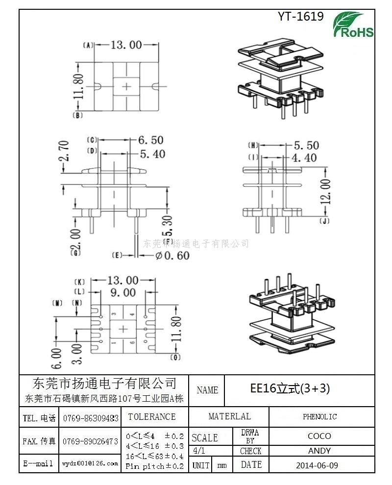 EE16变压器骨架EE16电木骨架EE16高频骨架 立式3+3P YT-1619