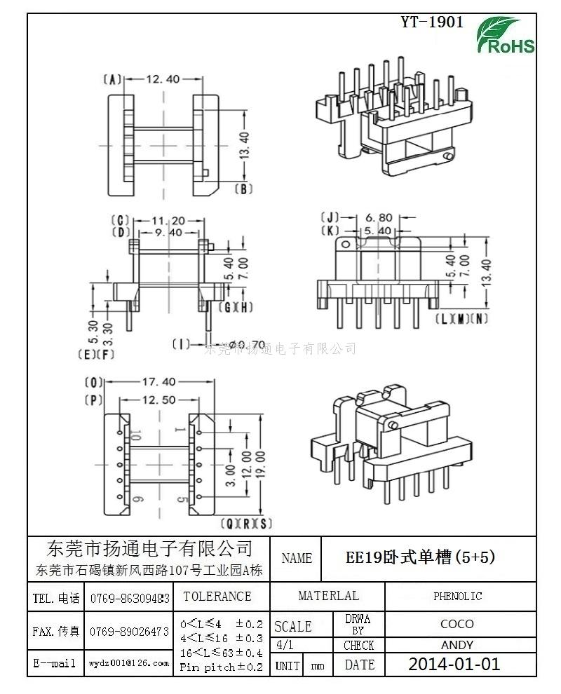 EE19变压器骨架EE19电木骨架EE19高频骨架 卧式单槽5+5P YT-1901