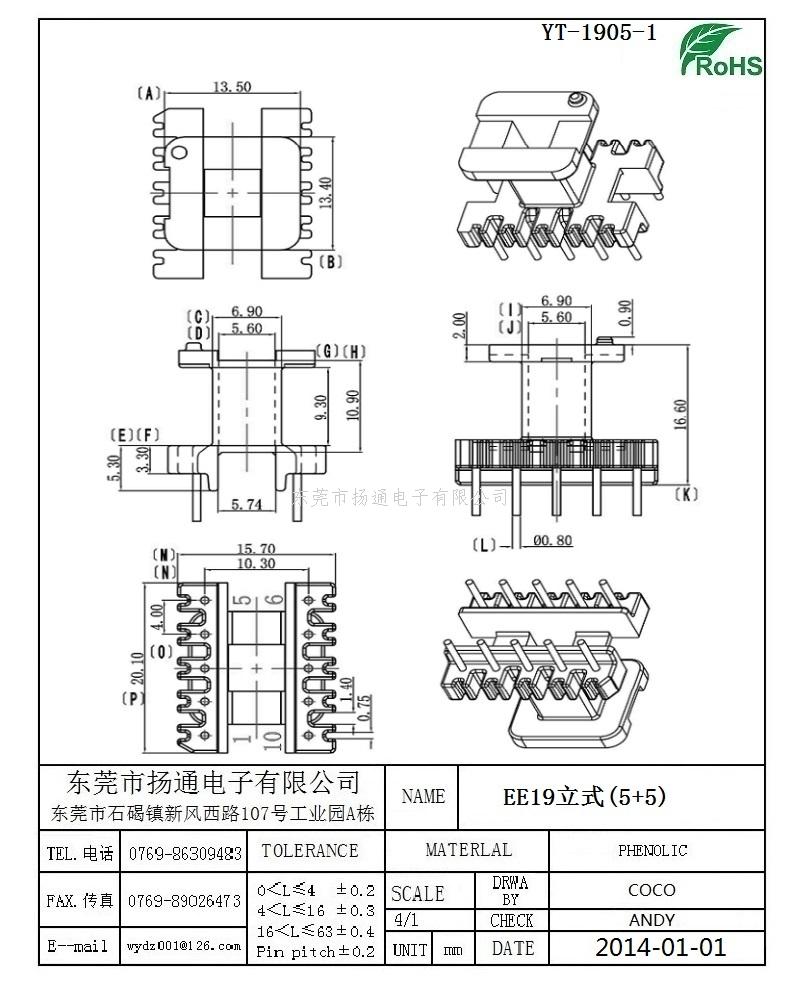 EE19变压器骨架EE19电木骨架EE19高频骨架 立式5+5P YT-1905-1