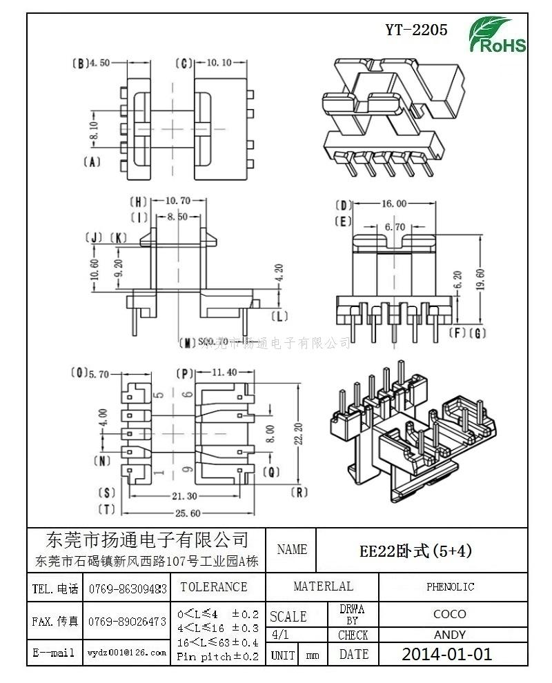 EE22变压器骨架EE22电木骨架EE22高频骨架 卧式5+4P YT-2205