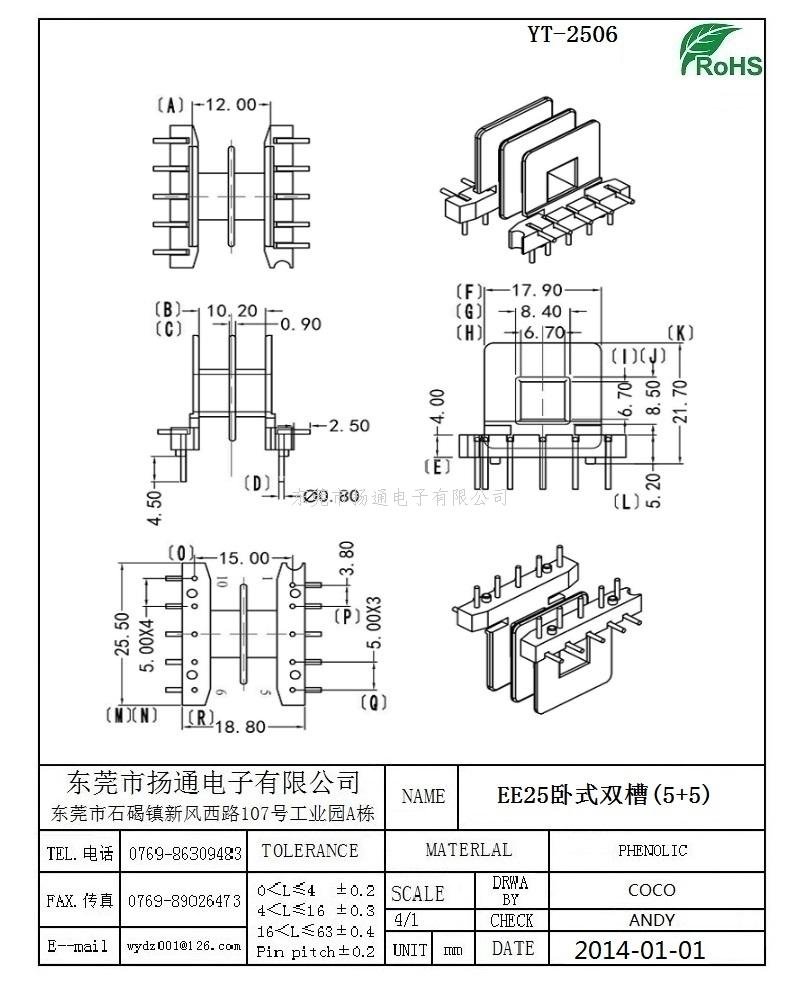 EE25变压器骨架EE25电木骨架EE25高频骨架 卧式双槽5+5P YT-2506