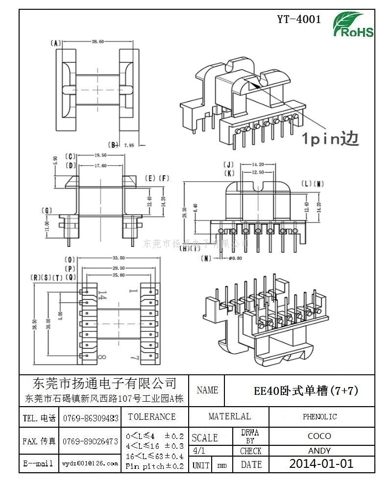 EE40变压器骨架EE40电木骨架EE40高频骨架 卧式单槽7+7P YT-4001