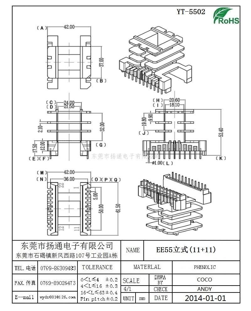 EE55变压器骨架EE55电木骨架EE55高频骨架 立式11+11P YT-5502