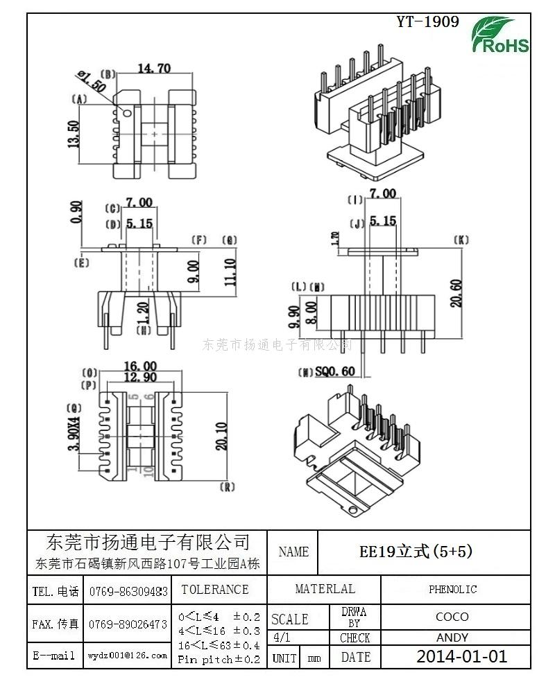 EE19变压器骨架EE19电木骨架EE19高频骨架 立式5+5P YT-1909