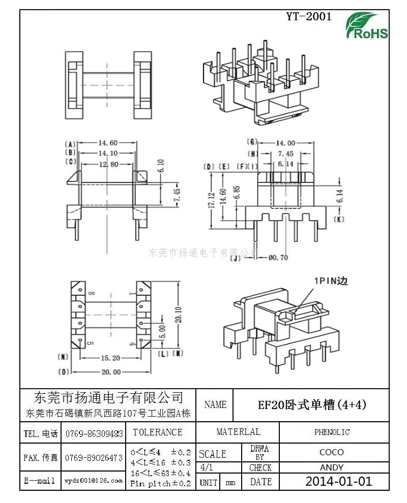 EF20变压器骨架EF20电木骨架EF20高频骨架 卧式单槽4+4P YT-2001