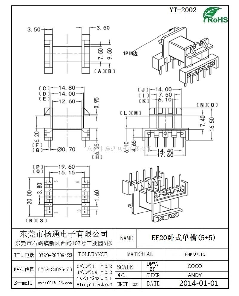 EF20变压器骨架EF20电木骨架EF20高频骨架 卧式单槽5+5P YT-2002