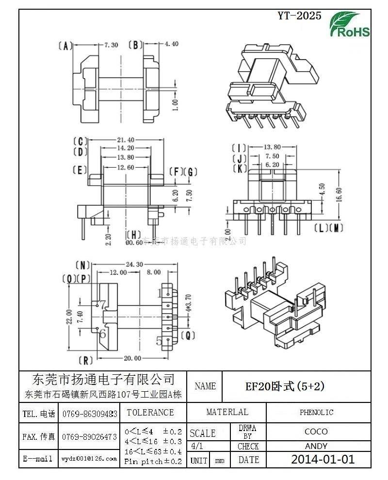 EF20变压器骨架EF20电木骨架EF20高频骨架 卧式5+2P YT-2025