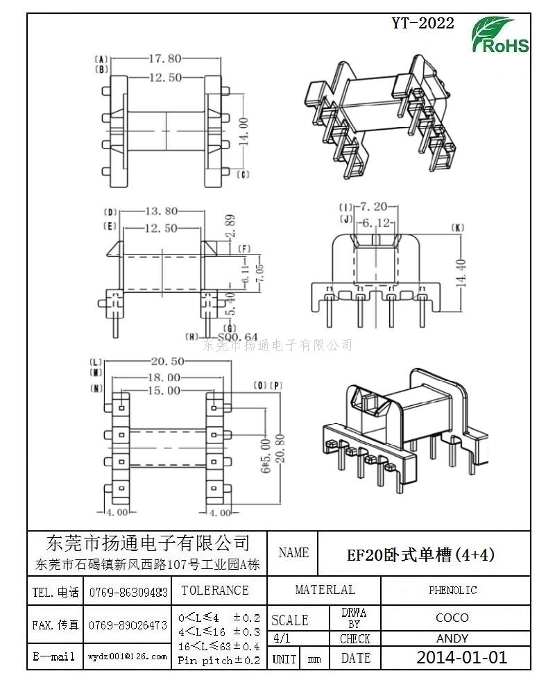 EF20变压器骨架EF20电木骨架EF20高频骨架 卧式单槽4+4P YT-2022