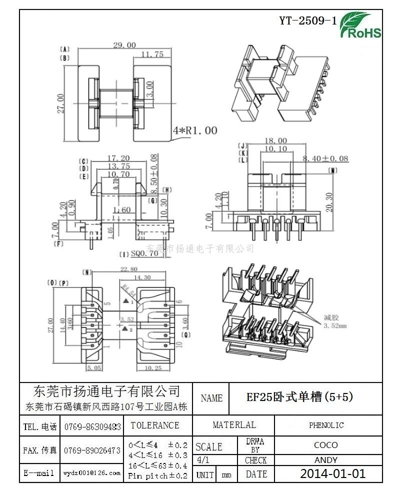 EF25变压器骨架EF25电木骨架EF25高频骨架 卧式单槽5+5P YT-2509-1