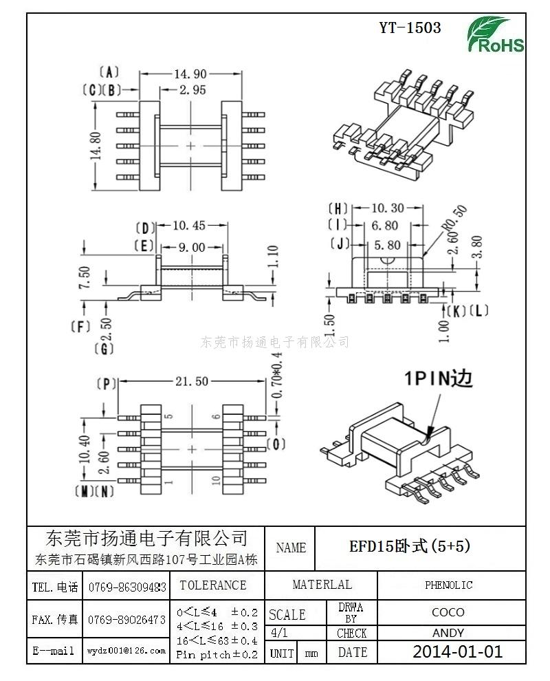 EFD15变压器骨架EFD15电木骨架EFD15高频骨架 卧式5+5P YT-1503