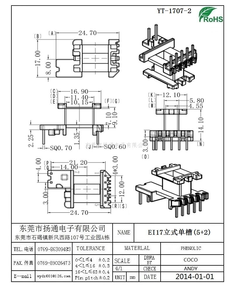 EI17变压器骨架EI17电木骨架EI17高频骨架 立式单槽5+2P YT-1707-2