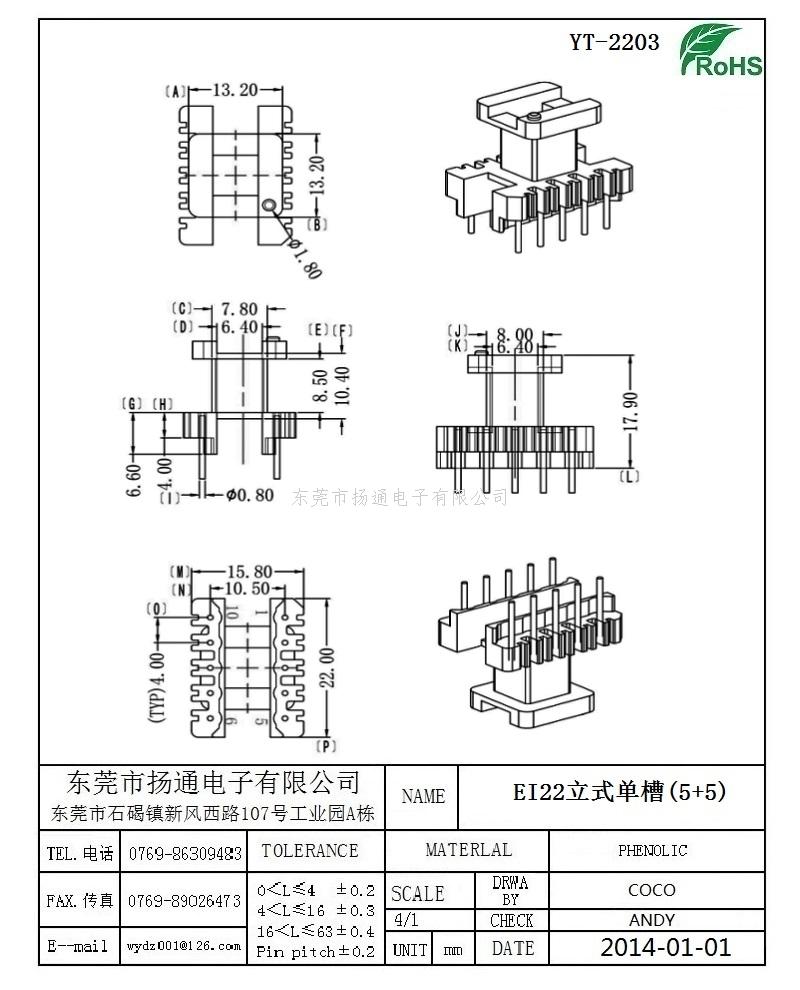EI22变压器骨架EI22电木骨架EI22高频骨架 立式单槽5+5P YT-2203