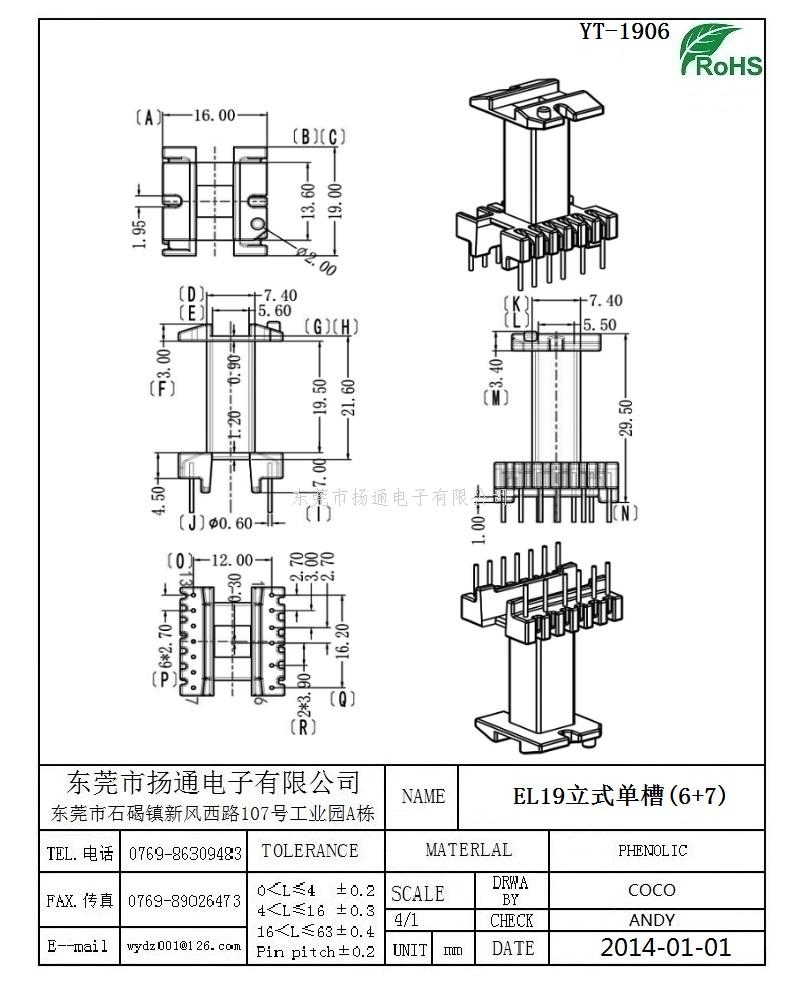 EL19变压器骨架EL19电木骨架EL19高频骨架 立式单槽6+7P YT-1906