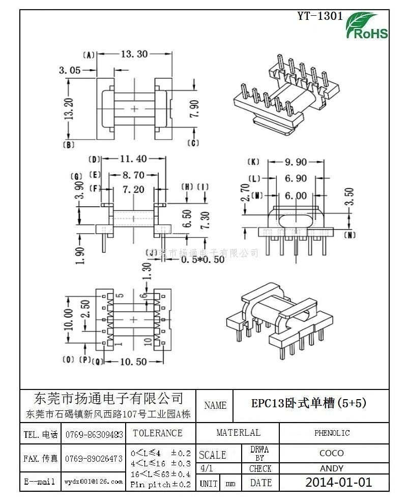 EPC13变压器骨架EPC13电木骨架EPC13高频骨架 卧式单槽5+5P YT-1301