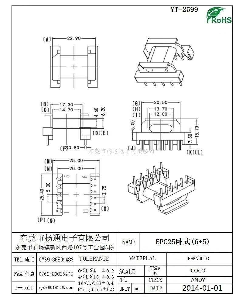 EPC25变压器骨架EPC25电木骨架EPC25高频骨架 卧式单槽6+5P YT-2599