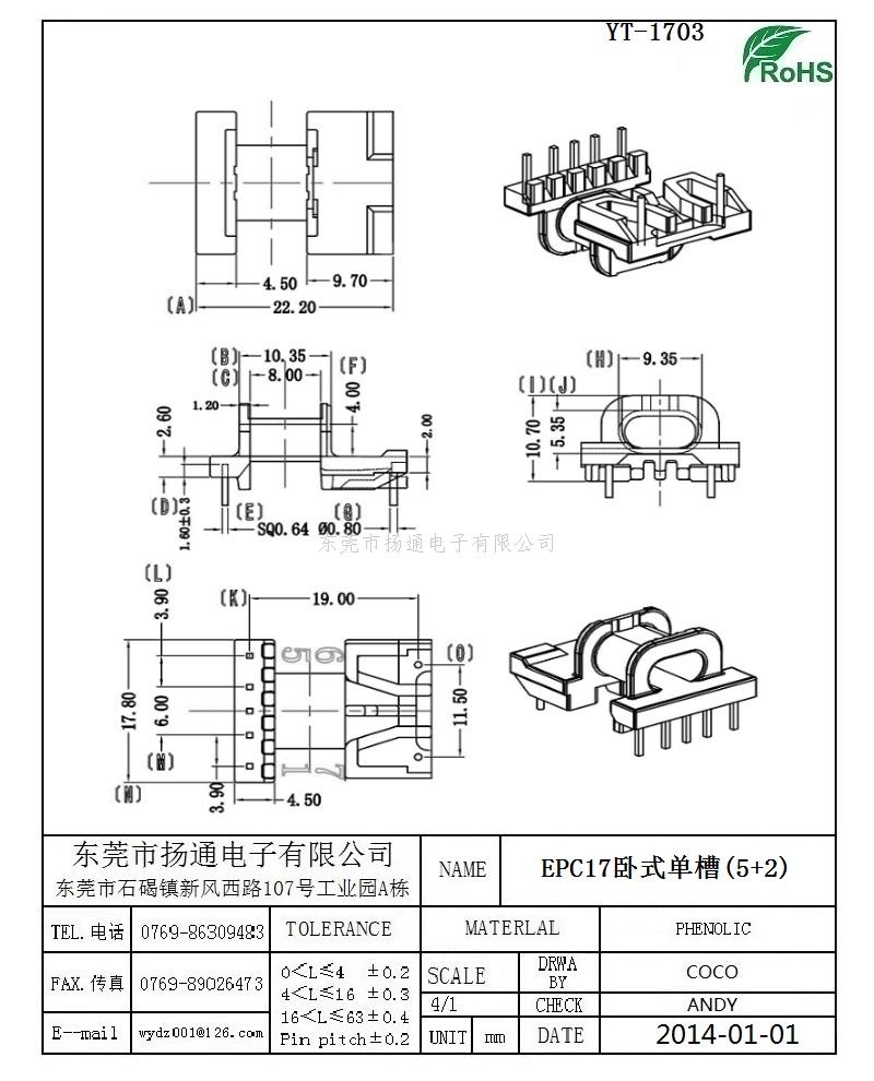 EPC17变压器骨架EPC17电木骨架EPC17高频骨架 卧式单槽5+2P YT-1703