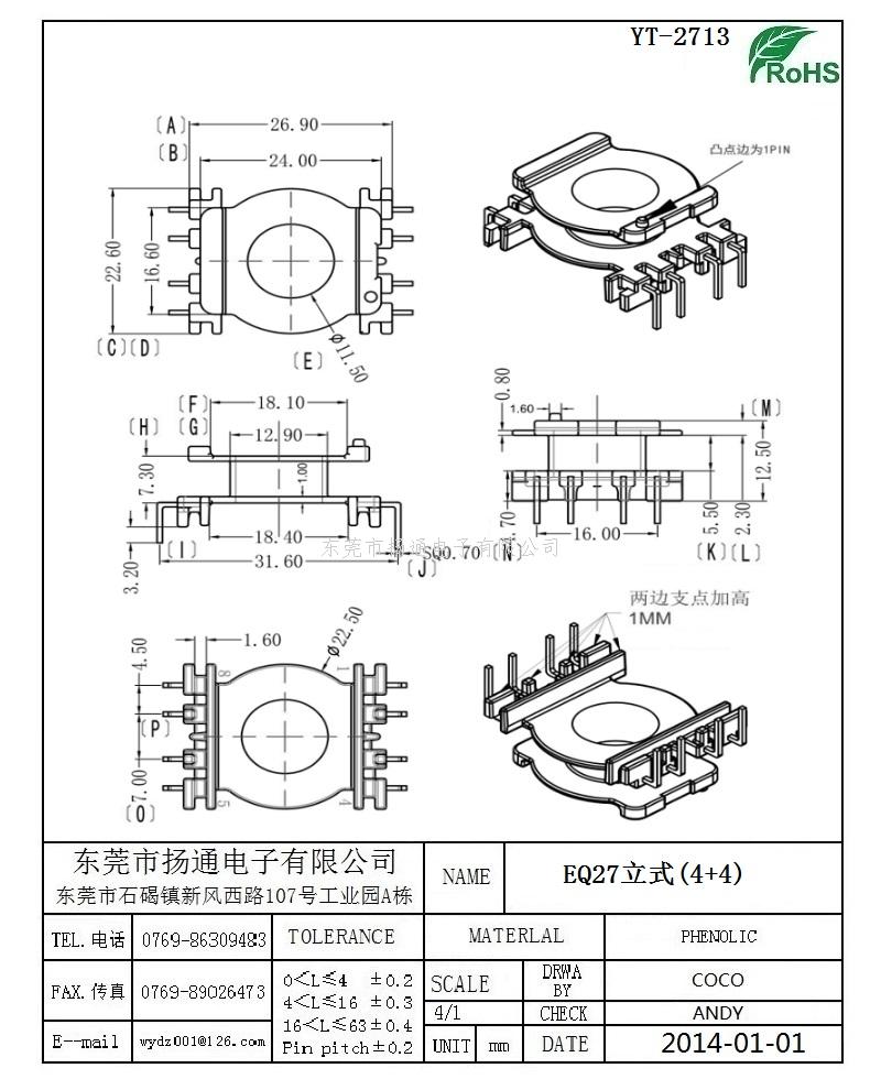 EQ27变压器骨架EQ27电木骨架EQ27高频骨架 立式4+4P YT-2713