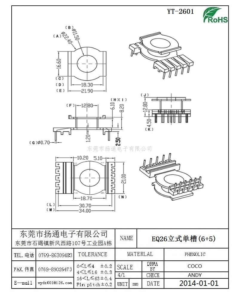 EQ26变压器骨架EQ26电木骨架EQ26高频骨架 立式单槽6+5P YT-2601