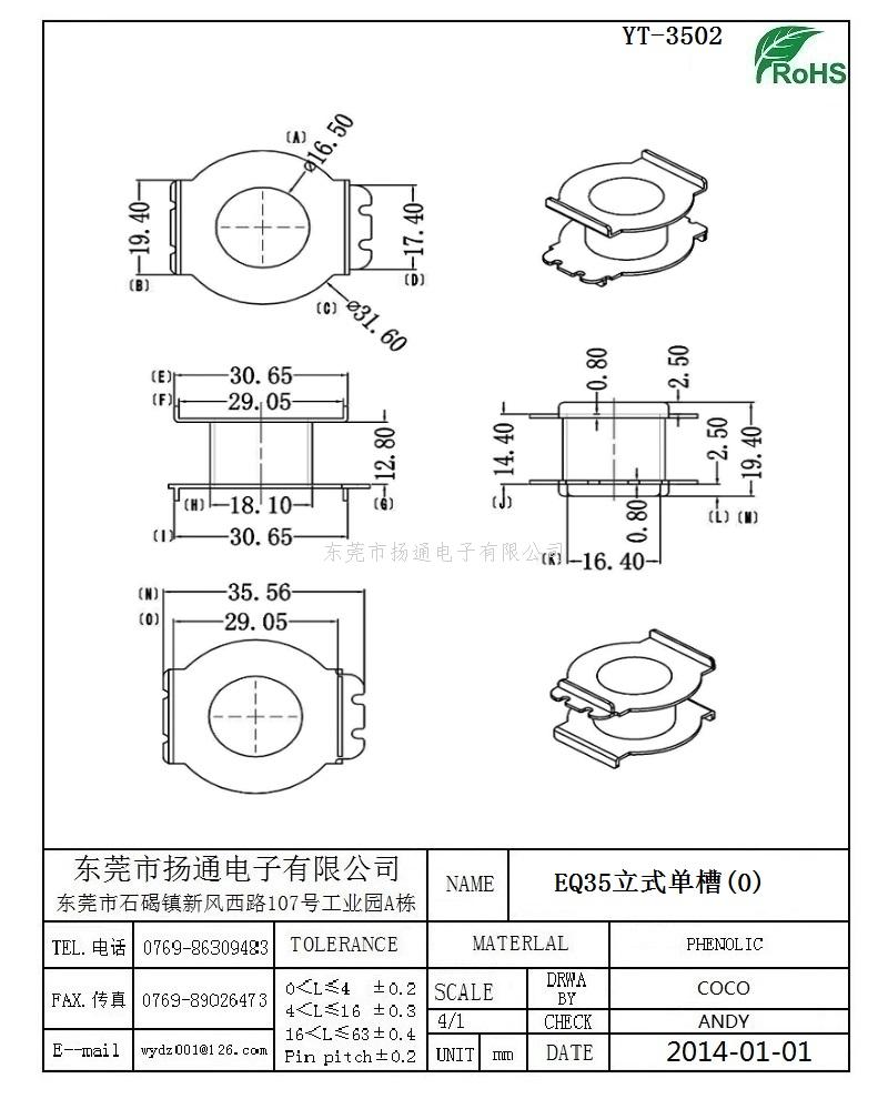 EQ35变压器骨架EQ35电木骨架EQ35高频骨架 立式单槽 YT-3502
