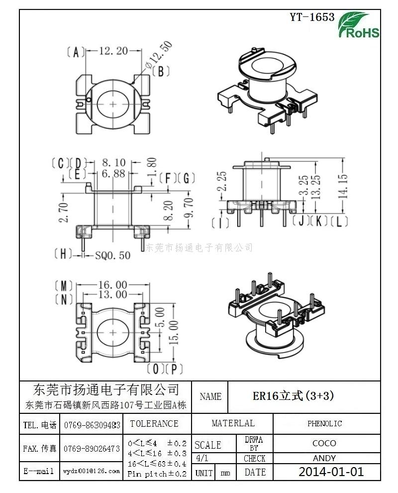 ER16变压器骨架ER16电木骨架ER16高频骨架 立式3+3 YT-1653