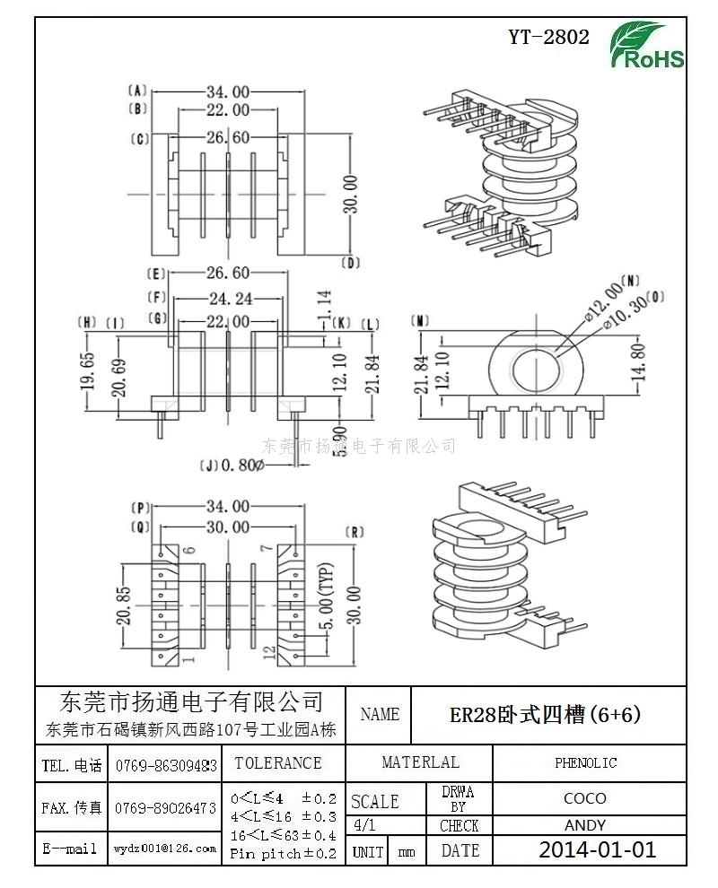 ER28变压器骨架ER28电木骨架ER28高频骨架 卧式四槽6+6 YT-2802