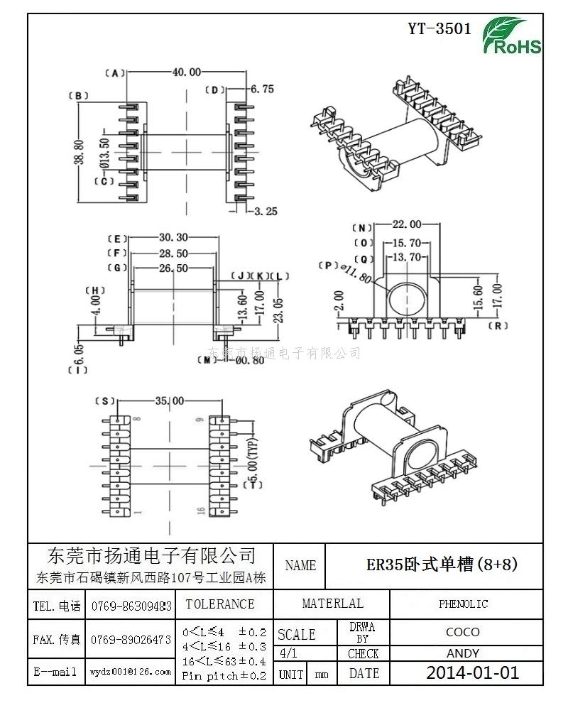 ER35变压器骨架ER35电木骨架ER35高频骨架 卧式单槽8+8 YT-3501