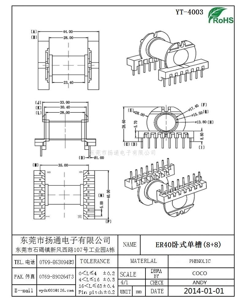 ER40变压器骨架ER40电木骨架ER40高频骨架 卧式单槽8+8 YT-4003