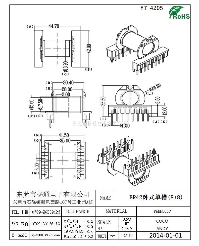 ER42变压器骨架ER42电木骨架ER42高频骨架 卧式单槽8+8 YT-4205