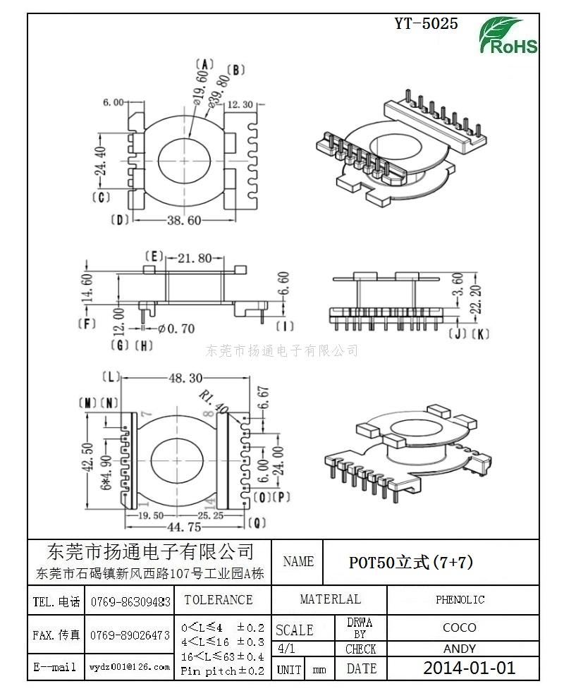 POT50变压器骨架POT50电木骨架POT50高频骨架 立式7+7P YT-5025