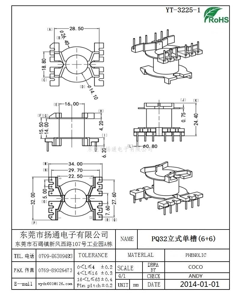 PQ32变压器骨架PQ32电木骨架PQ32高频骨架 立式单槽6+6P YT-3225-1