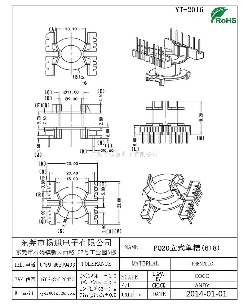 PQ20变压器骨架PQ20电木骨架PQ20高频骨架 立式单槽6+8P YT-2016