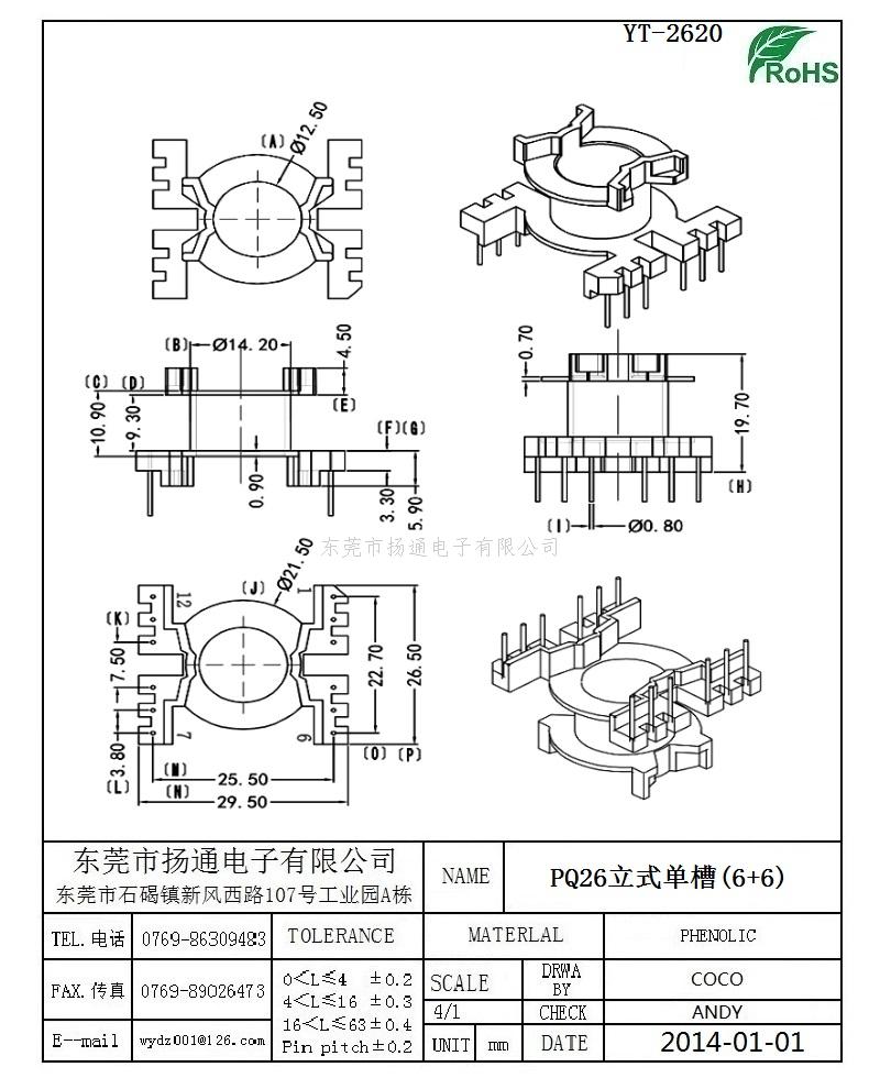 PQ26变压器骨架PQ26电木骨架PQ26高频骨架 立式单槽6+6P YT-2620