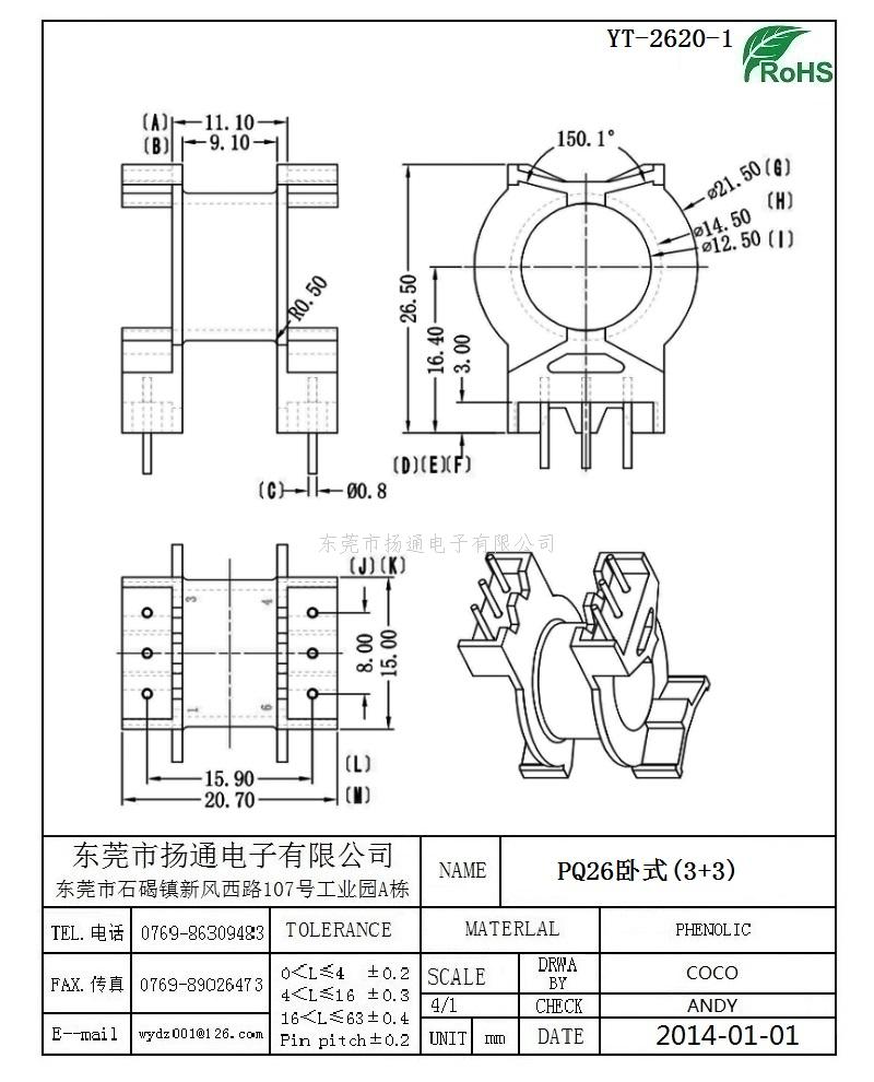 PQ26变压器骨架PQ26电木骨架PQ26高频骨架 卧式3+3P YT-2620-1