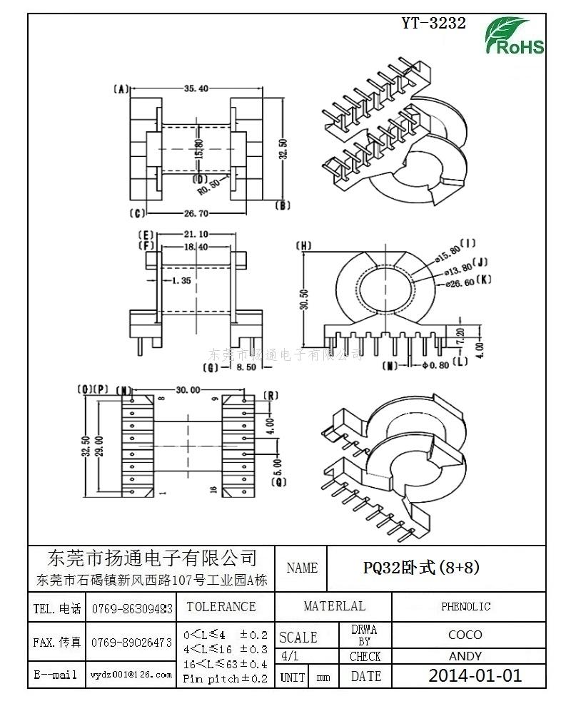 PQ32变压器骨架PQ32电木骨架PQ32高频骨架 卧式8+8P YT-3232