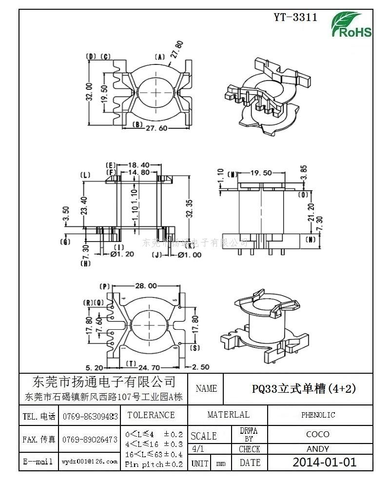 PQ33变压器骨架PQ33电木骨架PQ33高频骨架 立式4+2P YT-3311