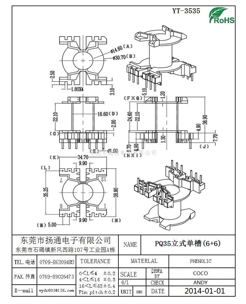 PQ35变压器骨架PQ35电木骨架PQ35高频骨架 立式单槽6+6P YT-3535