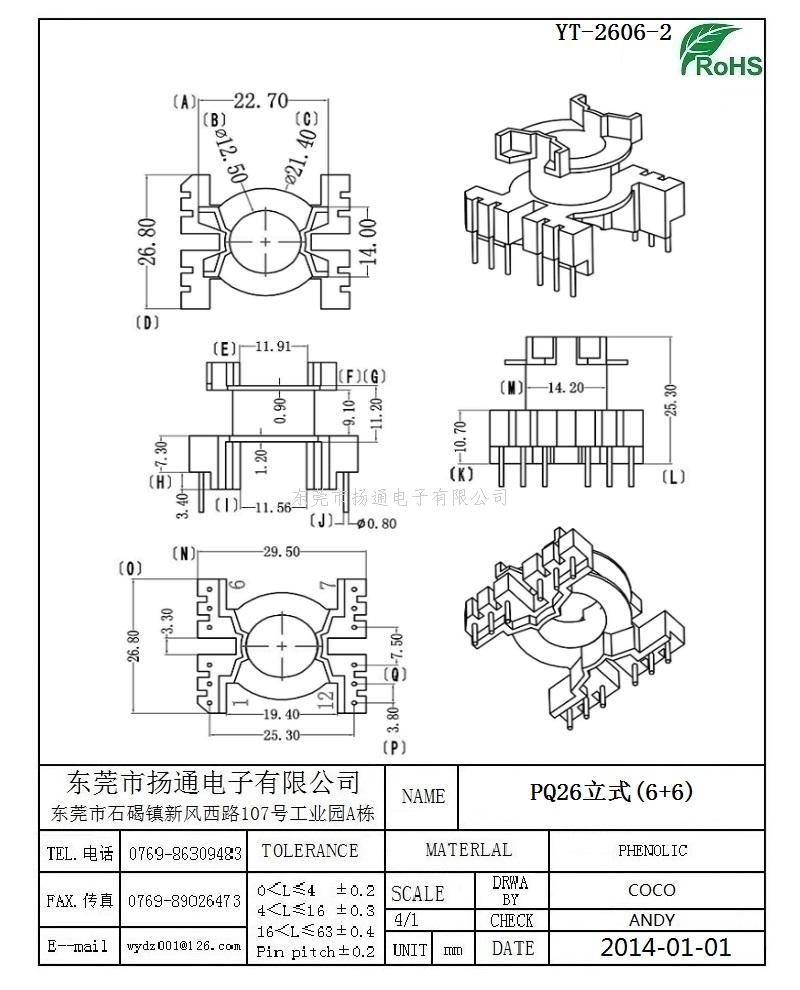 PQ26变压器骨架PQ26电木骨架PQ26高频骨架 立式6+6P YT-2606-2
