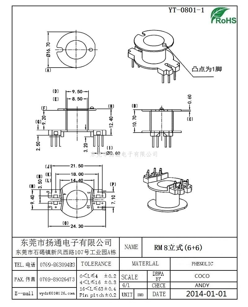 RM8变压器骨架RM8电木骨架RM8高频骨架 立式6+6P YT-0801-1