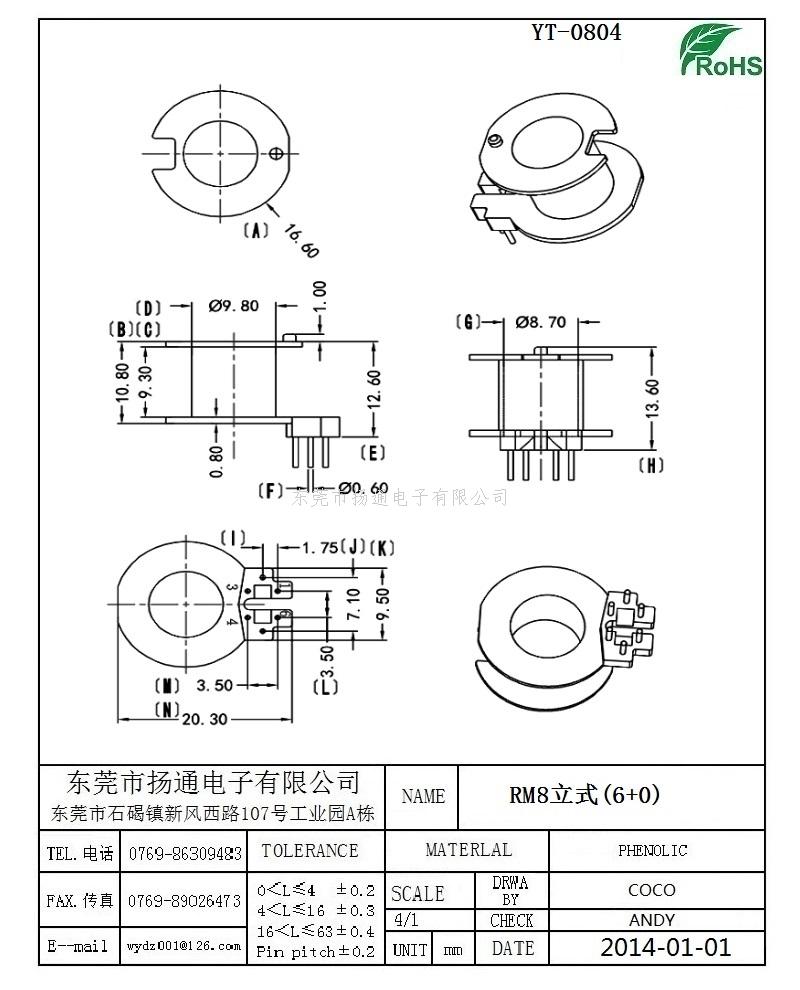 RM8变压器骨架RM8电木骨架RM8高频骨架 立式6+0P YT-0804