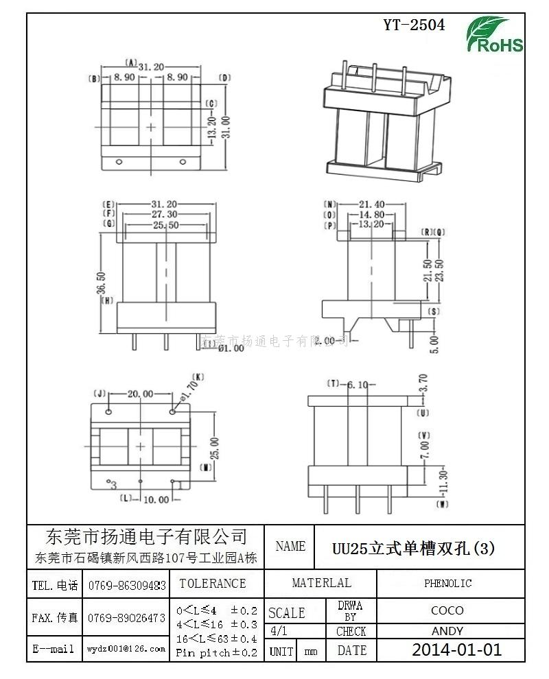UU25变压器骨架UU25电木骨架UU25高频骨架 立式单槽双孔骨架 YT-2504