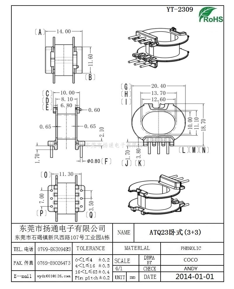 ATQ23电木骨架ATQ23变压器骨架ATQ23电源骨架 卧式3+3P YT-2309