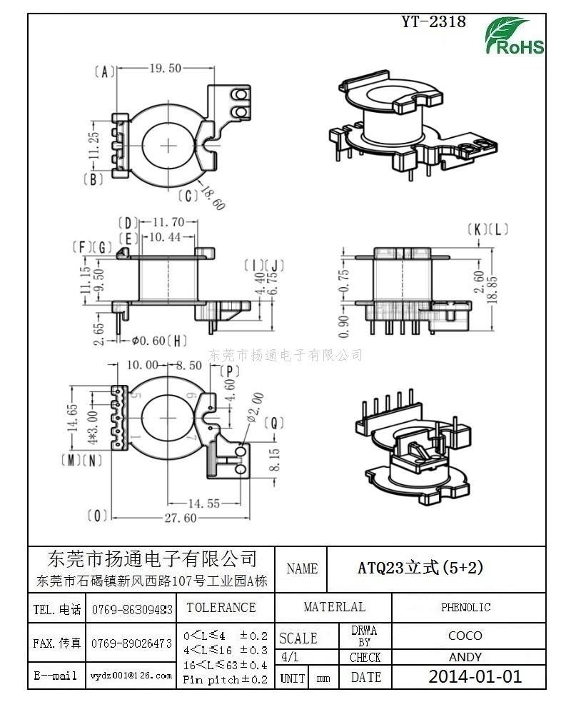 ATQ23电木骨架ATQ23变压器骨架ATQ23电源骨架 立式5+2P YT-2318