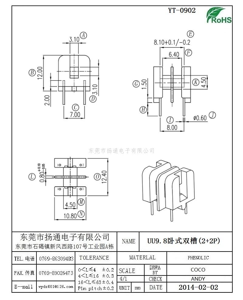 UU9.8变压器骨架UU9.8电木骨架UU9.8高频骨架 卧式双槽2+2P YT-0902