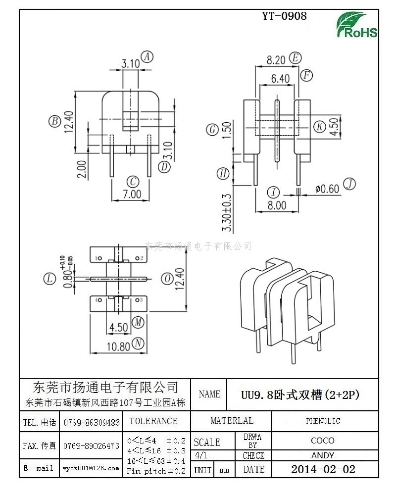 UU9.8变压器骨架UU9.8电木骨架UU9.8高频骨架 卧式双槽2+2P YT-0908